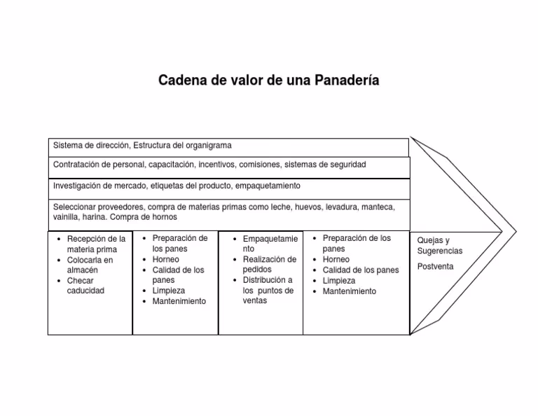 La cadena de valor de la panadería incluye actividades como la obtención de ingredientes, la mezcla y cocción de la masa, el envasado de los productos terminados y la comercialización y venta de los productos .