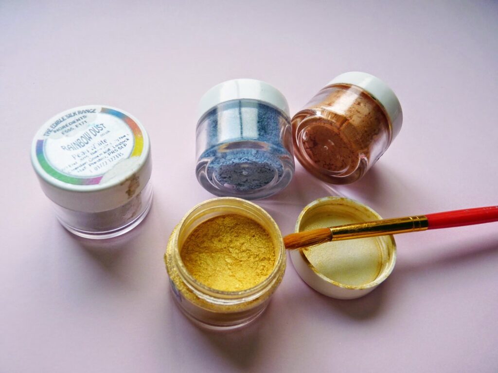 Estos son quizás los productos más comunes y versátiles para añadir color dorado. Son polvos finos con partículas de mica u otros ingredientes seguros para el consumo que reflejan la luz, creando un efecto metálico o nacarado. Vienen en diferentes tonos de dorado (oro pálido, oro rico, oro rosado, oro antiguo) y acabados (mate metalizado, brillante, con purpurina).