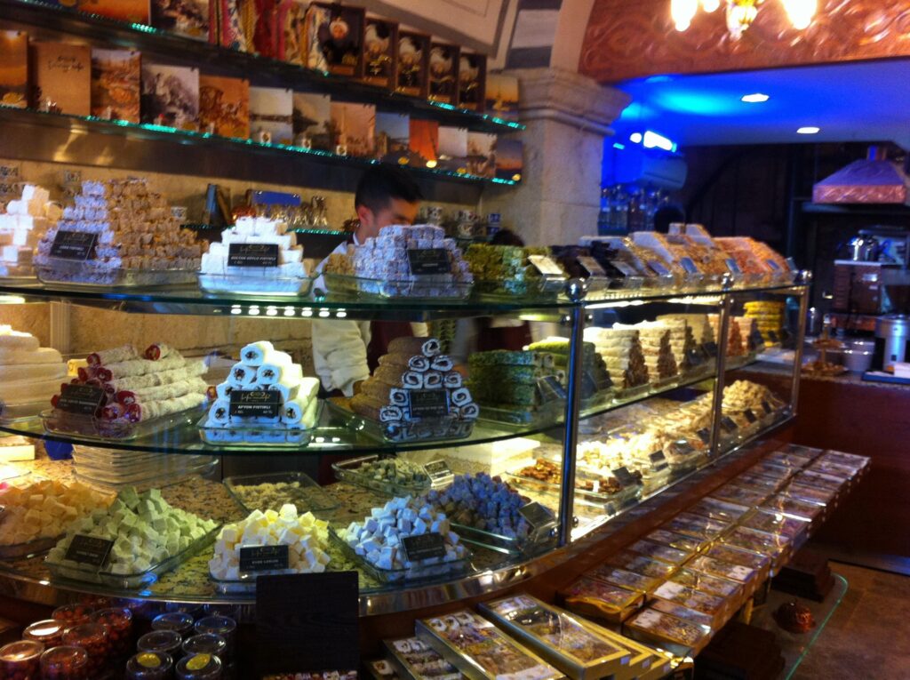 Todos estamos familiarizados con el Turkish Delight, los cubos blandos de gel azucarado aromatizados con todo, desde agua de rosas hasta menta. Comúnmente servidos al final de las comidas como un capricho, también son un excelente recuerdo de una visita a Estambul. El nombre original es rahat-ul hulkum, que significa 'aliviar la garganta'. Un viajero inglés los llamó 'Turkish Delight' en el siglo XVIII, y han sido uno de los postres favoritos del mundo desde entonces. Ahora conocidos simplemente como Lokum en Turquía, el sabor más popular es el de pistacho. Sea cual sea el sabor que pruebes, encontrarás una experiencia muy diferente y superior a cualquier cosa que hayas probado fuera de Turquía.